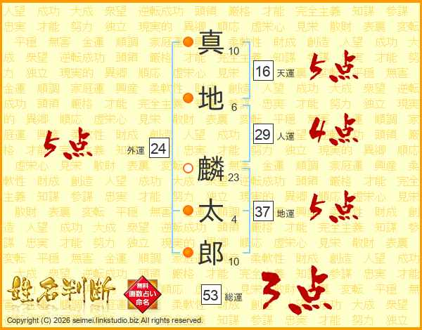 真(10画)地(6画) 麟(23画)太(4画)郎(10画)