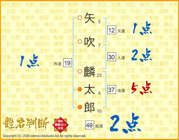 矢(5画)吹(7画) 麟(23画)太(4画)郎(10画)