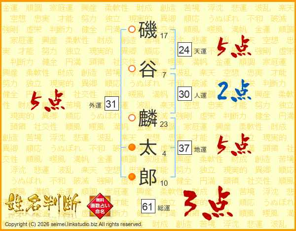 磯(17画)谷(7画) 麟(23画)太(4画)郎(10画)