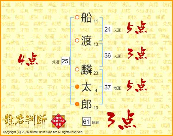 船(11画)渡(13画) 麟(23画)太(4画)郎(10画)
