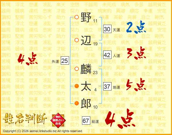 野(11画)辺(19画) 麟(23画)太(4画)郎(10画)