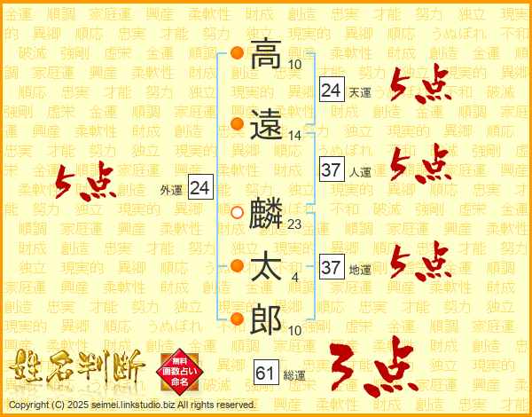 高(10画)遠(14画) 麟(23画)太(4画)郎(10画)