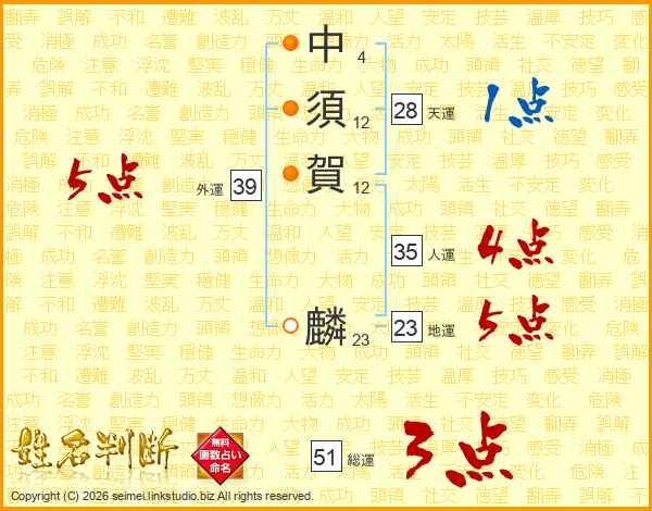 中(4画)須(12画)賀(12画) 麟(23画)