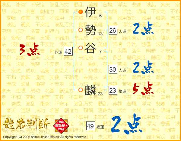 伊(6画)勢(13画)谷(7画) 麟(23画)