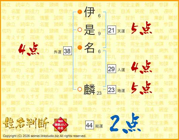あなたの人生を表す1番重要な運勢です。生涯を通じて影響する総合運となり、主に50歳以降の晩年期に影響を及ぼします。苗字と名前の合計画数。