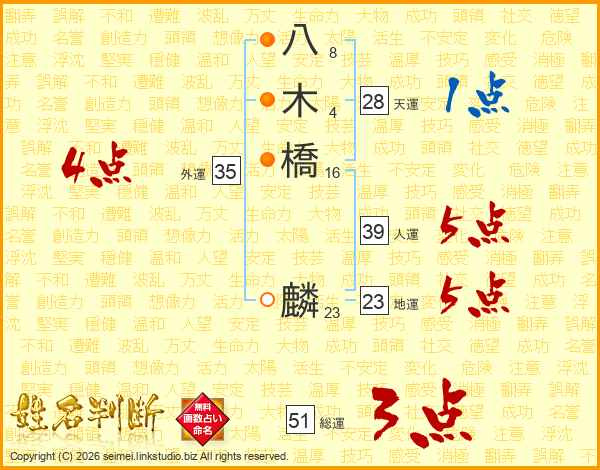 八木橋麟さんの人運は39画の5点!