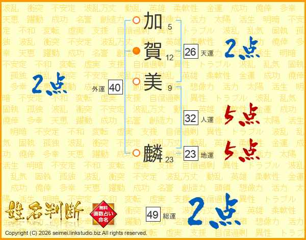 画数の奇数(○陽)と偶数(●陰)の配列で吉凶を占います。どちらかにかたよる名前は大凶名で避ける必要があります。画数の奇数偶数。