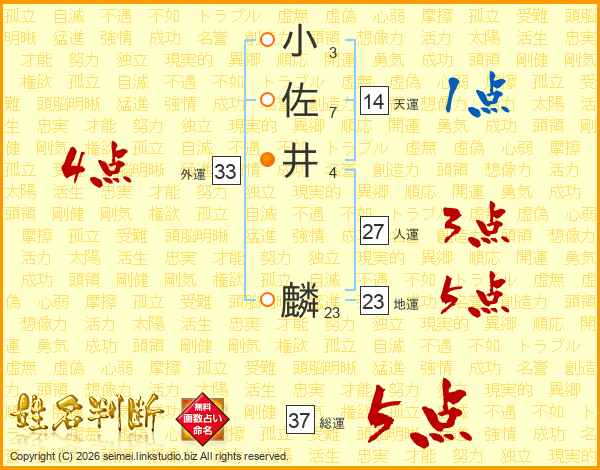 小佐井麟さんの総運は37画の5点