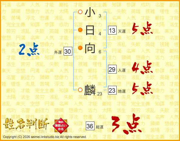 小日向麟さんの総運は36画の3点!