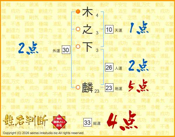 木之下麟さんの総運は33画の4点!