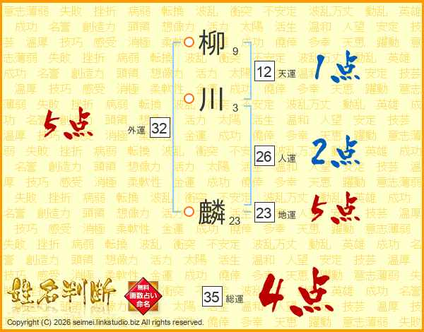柳(9画)川(3画) 麟(23画)