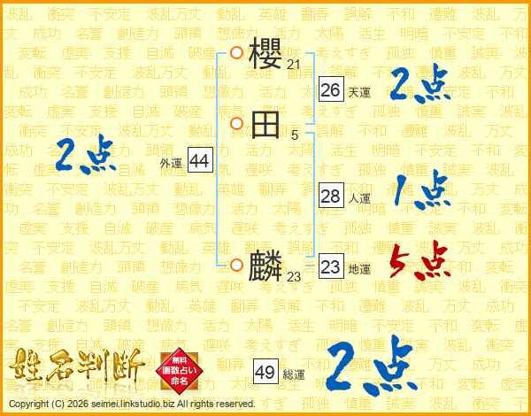 櫻田麟さんの天運は26画の2点