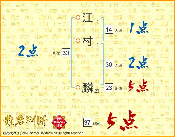 生活面を象徴する運勢です。外部から受ける影響力を表し、結婚運、家庭運や職場、環境への順応性を表します。総運から人運を引いた画数。姓や名が1文字の場合を除く。