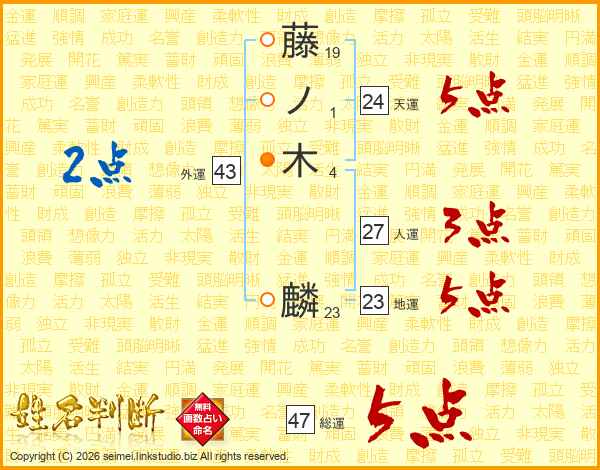 藤(19画)ノ(1画)木(4画) 麟(23画)