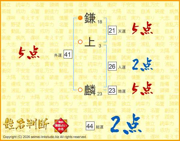 鎌上麟さんの総運は44画の2点!