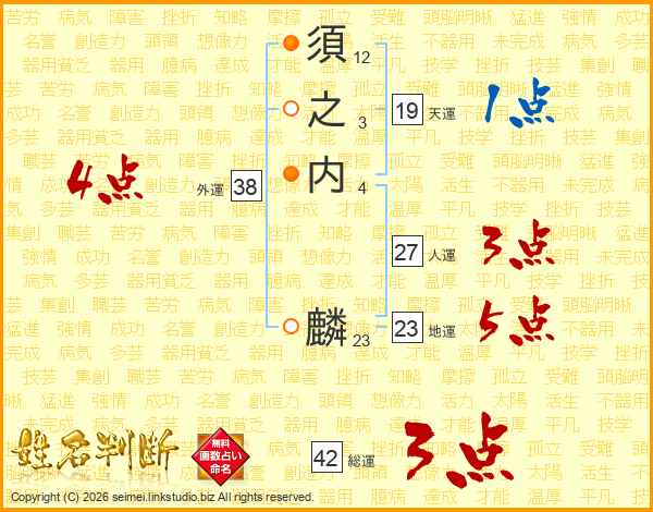 生活面を象徴する運勢です。外部から受ける影響力を表し、結婚運、家庭運や職場、環境への順応性を表します。総運から人運を引いた画数。姓や名が1文字の場合を除く。