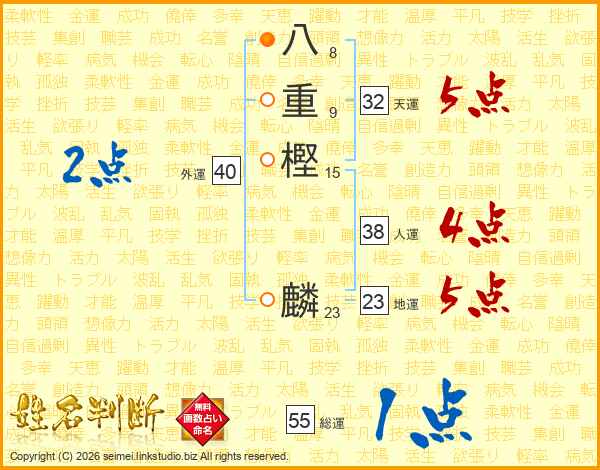八重樫麟さんの総運は55画の1点!