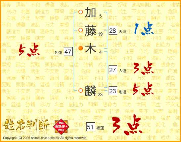 生活面を象徴する運勢です。外部から受ける影響力を表し、結婚運、家庭運や職場、環境への順応性を表します。総運から人運を引いた画数。姓や名が1文字の場合を除く。