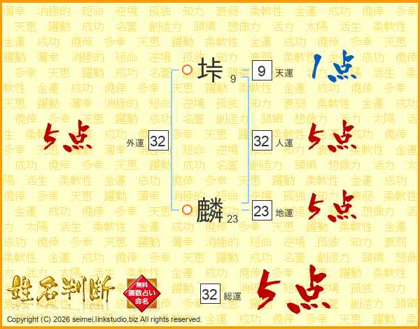 生活面を象徴する運勢です。外部から受ける影響力を表し、結婚運、家庭運や職場、環境への順応性を表します。総運から人運を引いた画数。姓や名が1文字の場合を除く。