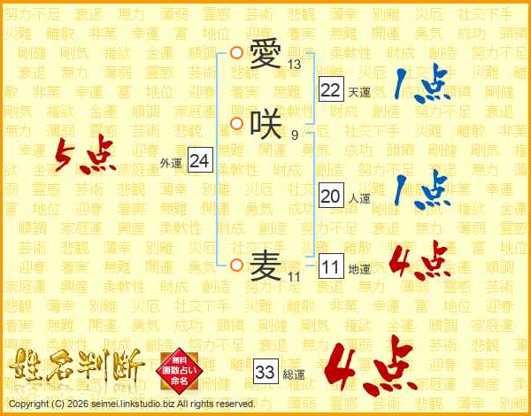 愛咲麦さんの総運は33画の4点!