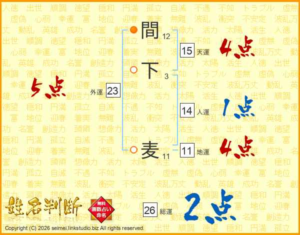 間下麦さんの総運は26画の2点!