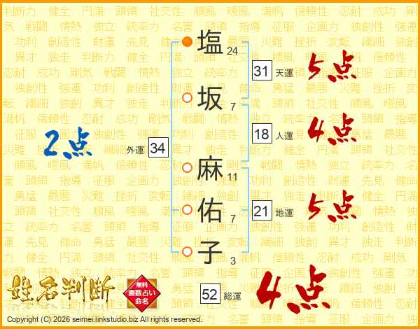 塩(24画)坂(7画) 麻(11画)佑(7画)子(3画)