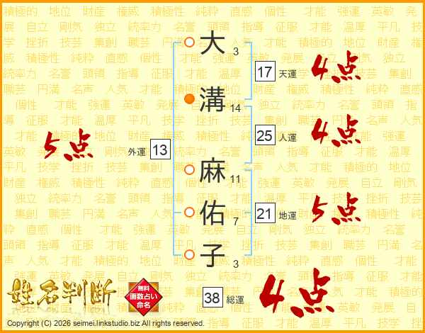 大(3画)溝(14画) 麻(11画)佑(7画)子(3画)