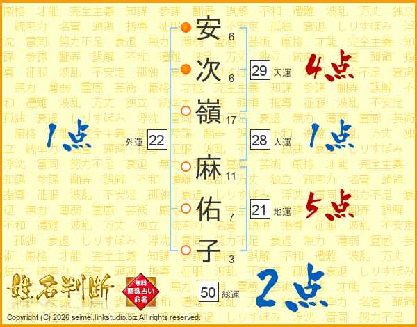 安(6画)次(6画)嶺(17画) 麻(11画)佑(7画)子(3画)