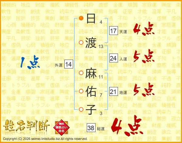 日(4画)渡(13画) 麻(11画)佑(7画)子(3画)