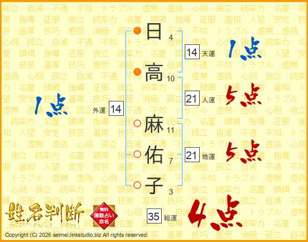 日(4画)高(10画) 麻(11画)佑(7画)子(3画)