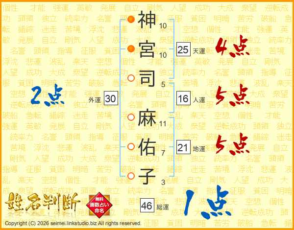 神(10画)宮(10画)司(5画) 麻(11画)佑(7画)子(3画)