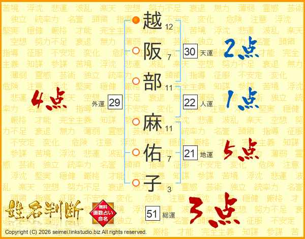 越(12画)阪(7画)部(11画) 麻(11画)佑(7画)子(3画)