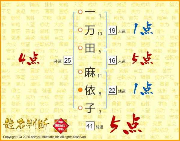 一(1画)万(13画)田(5画) 麻(11画)依(8画)子(3画)