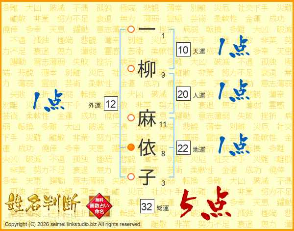一柳麻依子さんの総運は32画の5点!