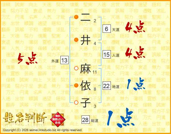 二(2画)井(4画) 麻(11画)依(8画)子(3画)