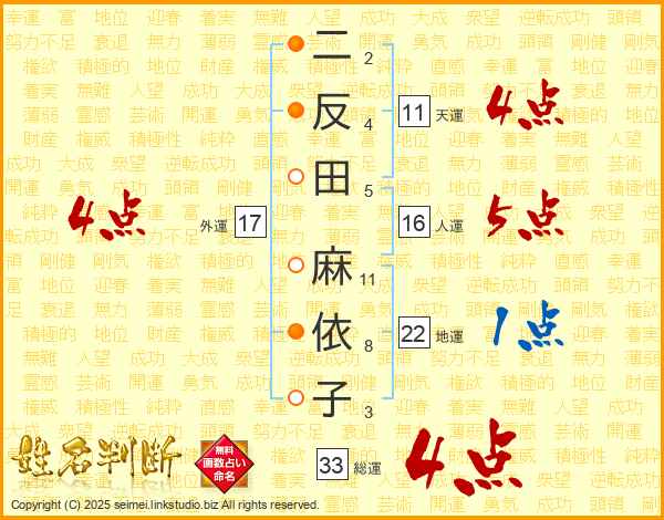 生活面を象徴する運勢です。外部から受ける影響力を表し、結婚運、家庭運や職場、環境への順応性を表します。総運から人運を引いた画数。姓や名が1文字の場合を除く。