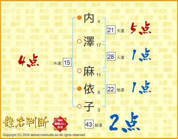 内(4画)澤(17画) 麻(11画)依(8画)子(3画)