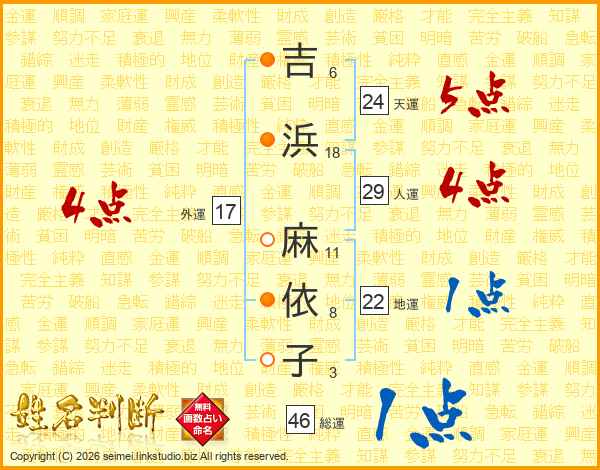 吉(6画)浜(18画) 麻(11画)依(8画)子(3画)