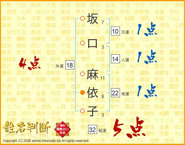 坂口麻依子さんの総運は32画の5点!