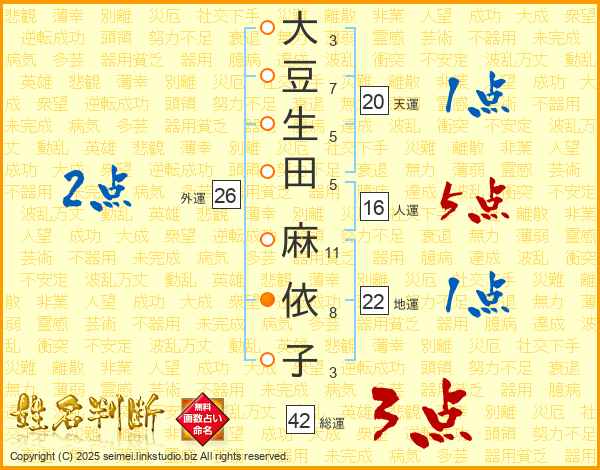 大(3画)豆(7画)生(5画)田(5画) 麻(11画)依(8画)子(3画)