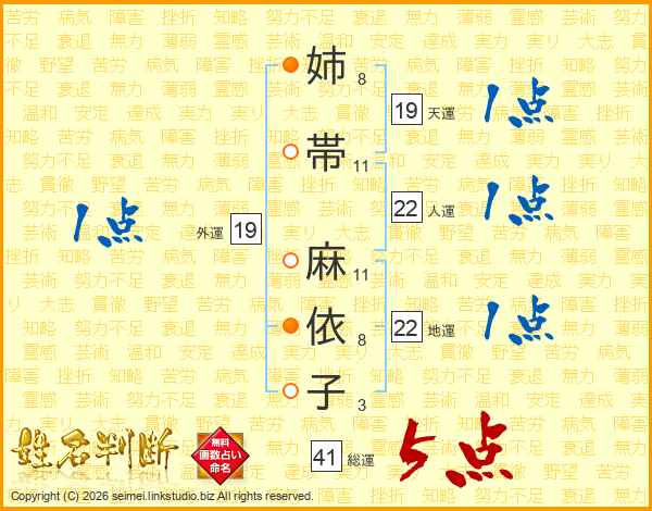 姉(8画)帯(11画) 麻(11画)依(8画)子(3画)
