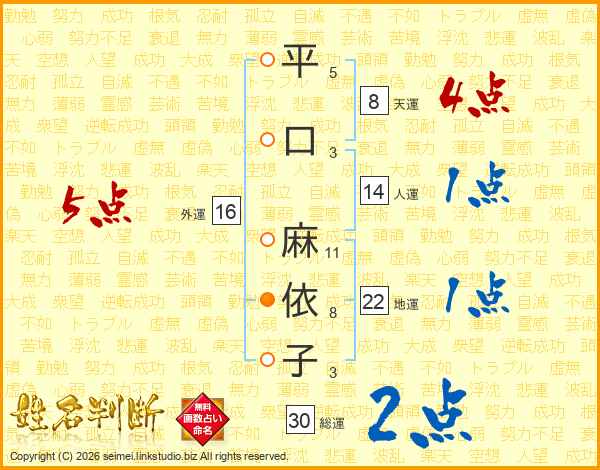 平(5画)口(3画) 麻(11画)依(8画)子(3画)