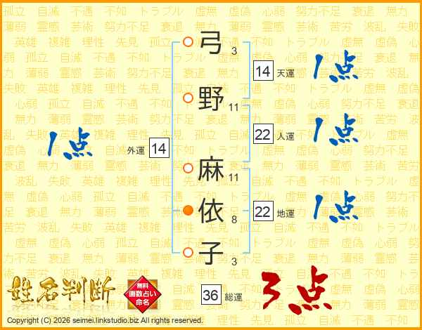 弓(3画)野(11画) 麻(11画)依(8画)子(3画)