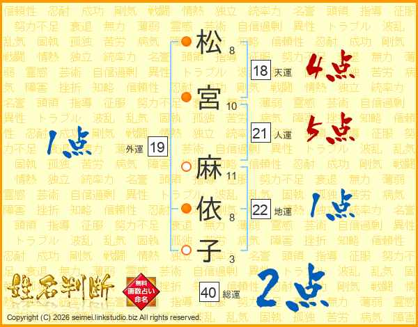 松(8画)宮(10画) 麻(11画)依(8画)子(3画)