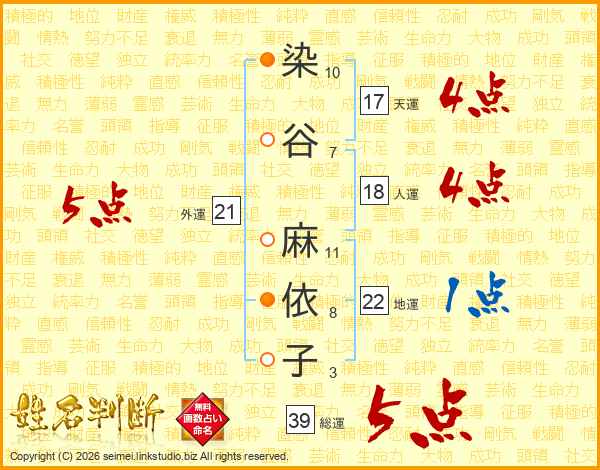 染(10画)谷(7画) 麻(11画)依(8画)子(3画)