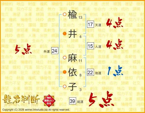 楡井麻依子さんの総運は39画の5点!