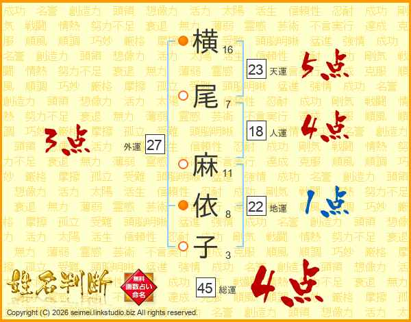 横(16画)尾(7画) 麻(11画)依(8画)子(3画)