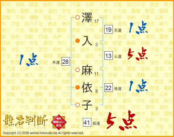 澤(17画)入(2画) 麻(11画)依(8画)子(3画)