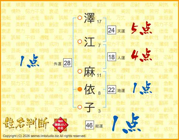 澤(17画)江(7画) 麻(11画)依(8画)子(3画)
