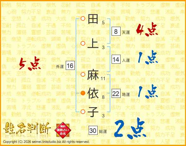 田(5画)上(3画) 麻(11画)依(8画)子(3画)